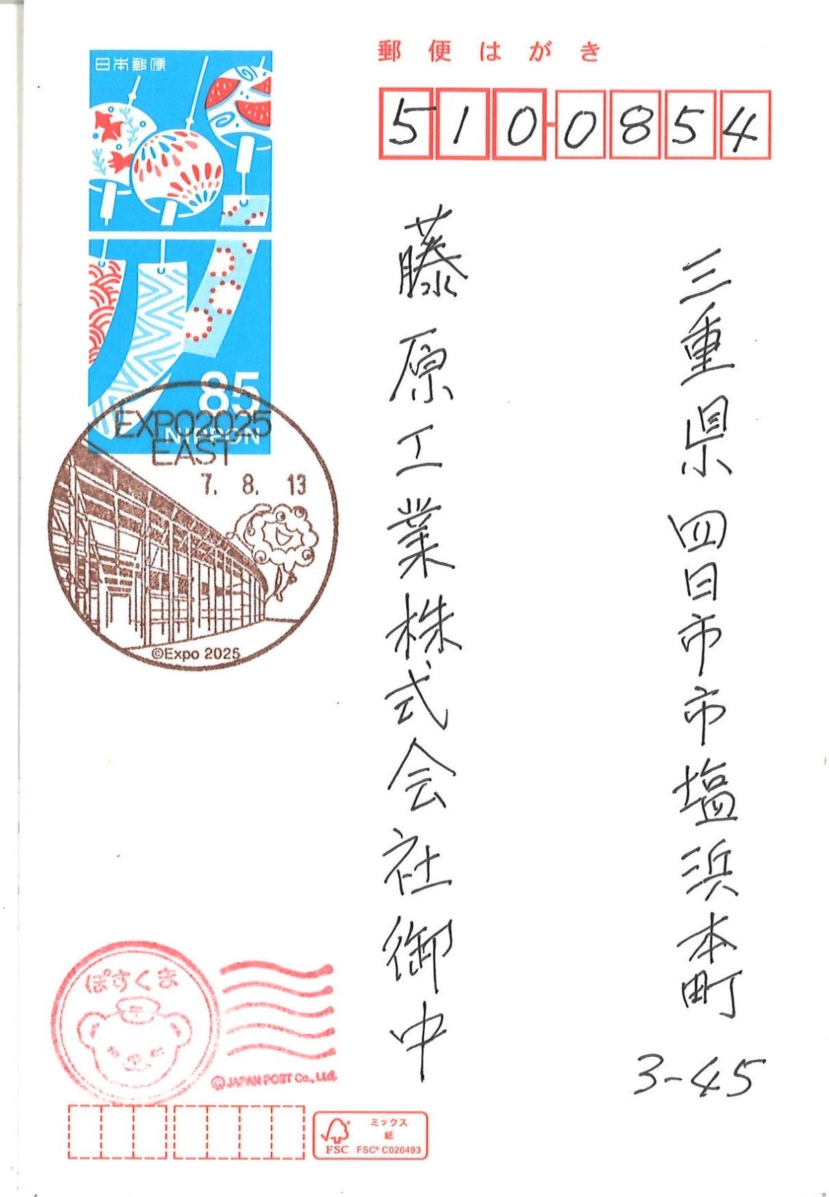 ※万博会場から、社長が暑中見舞いはがきを自社に送りました。