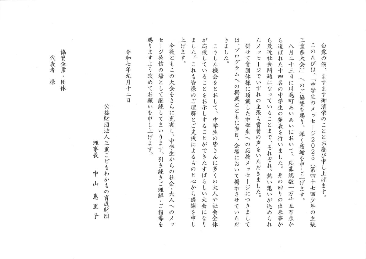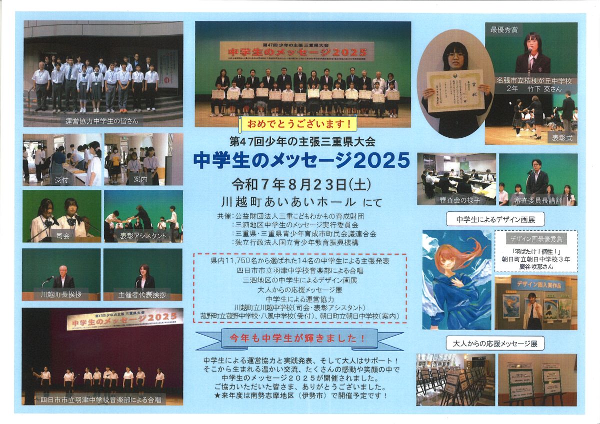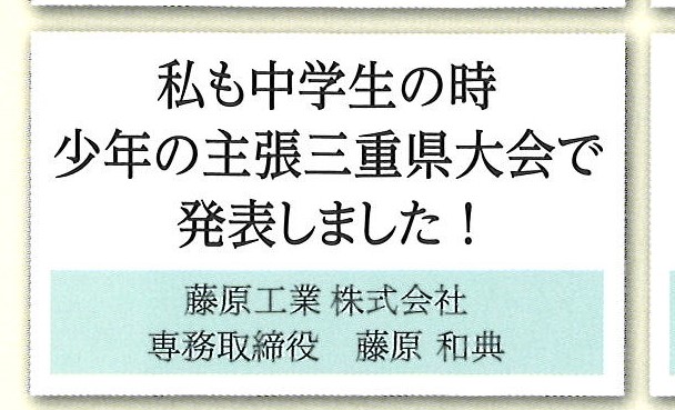 2025年10月27日 第47回少年の主張三重県大会に協賛しました!《中学生のメッセージ2025》 第47回少年の主張 三重県大会 中学生のメッセージ2025に協賛しました! 大人からの応援メッセージ展に、当社専務のメッセージを展示させていただきました! 当社は、四日市青少年育成市民会議の会員企業です! 藤原工業は、三重県で育つ青少年を応援、支援しています! 一覧へ戻る