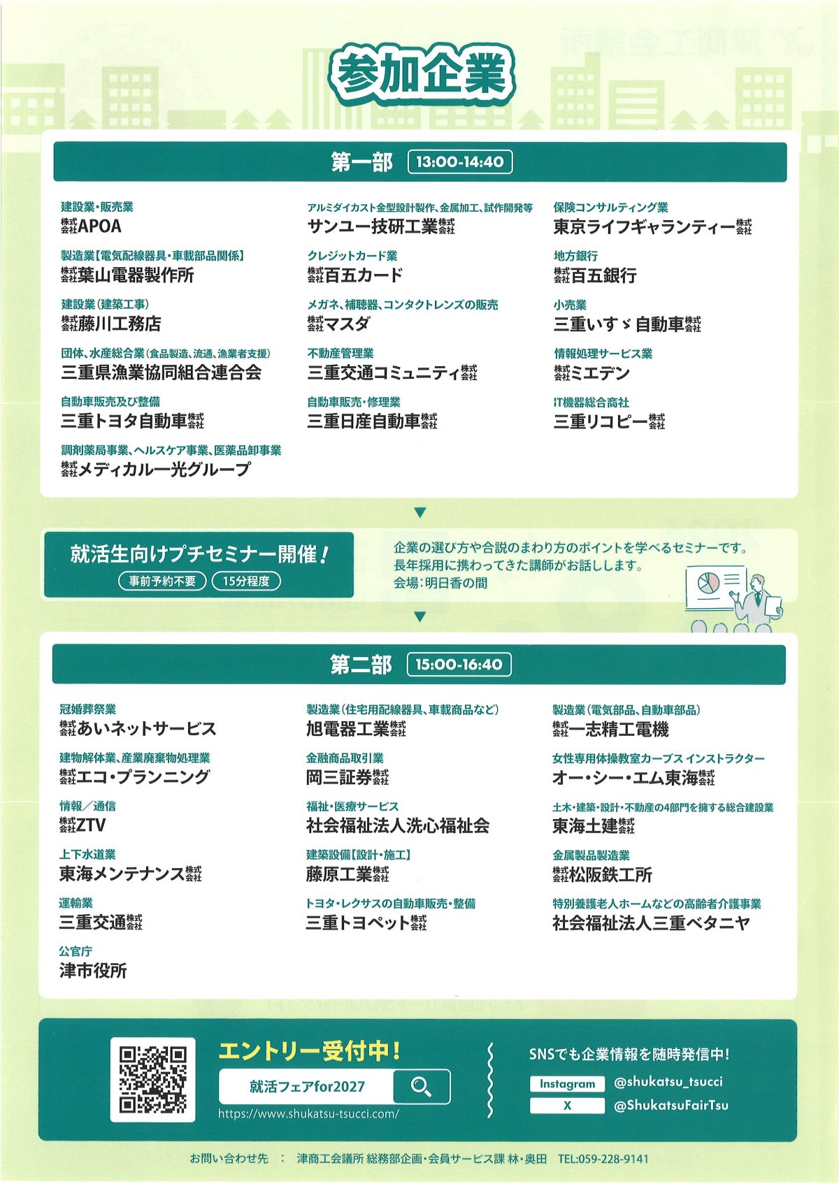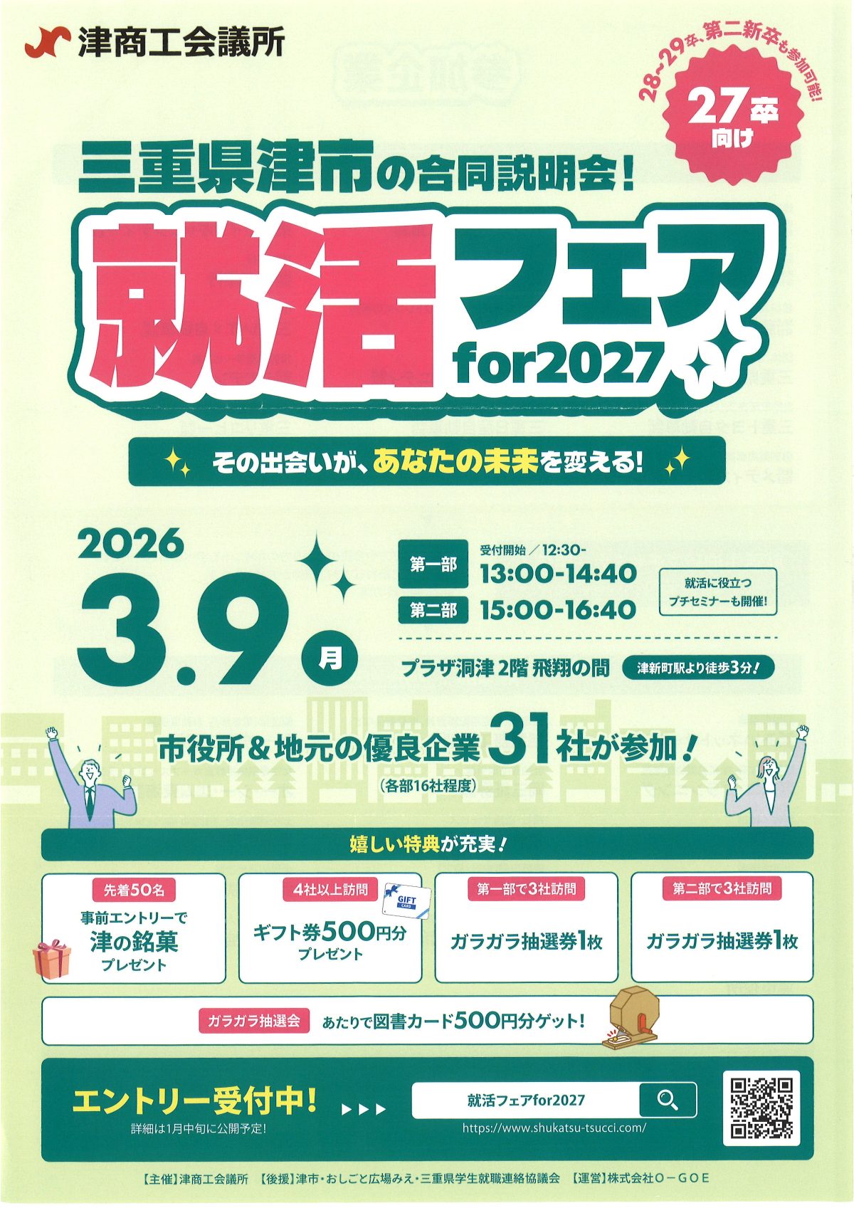 2026年02月24日 3/9 就活フェアfor2027《津商工会議所主催》プラザ洞津 就活フェア for 2027に、当社ブースを出展します! 日時:2026年3月9日(月)第二部 15:00-16:40 場所:プラザ洞津2階 飛翔の間(津新町駅より徒歩3分) 津商工会議所主催です。地元の優良企業が参加します! 当社ブースにぜひお越しください! 一覧へ戻る