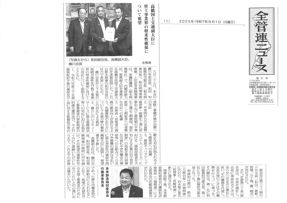 管工事業界の将来性確保についての要望【全管連ニュース】