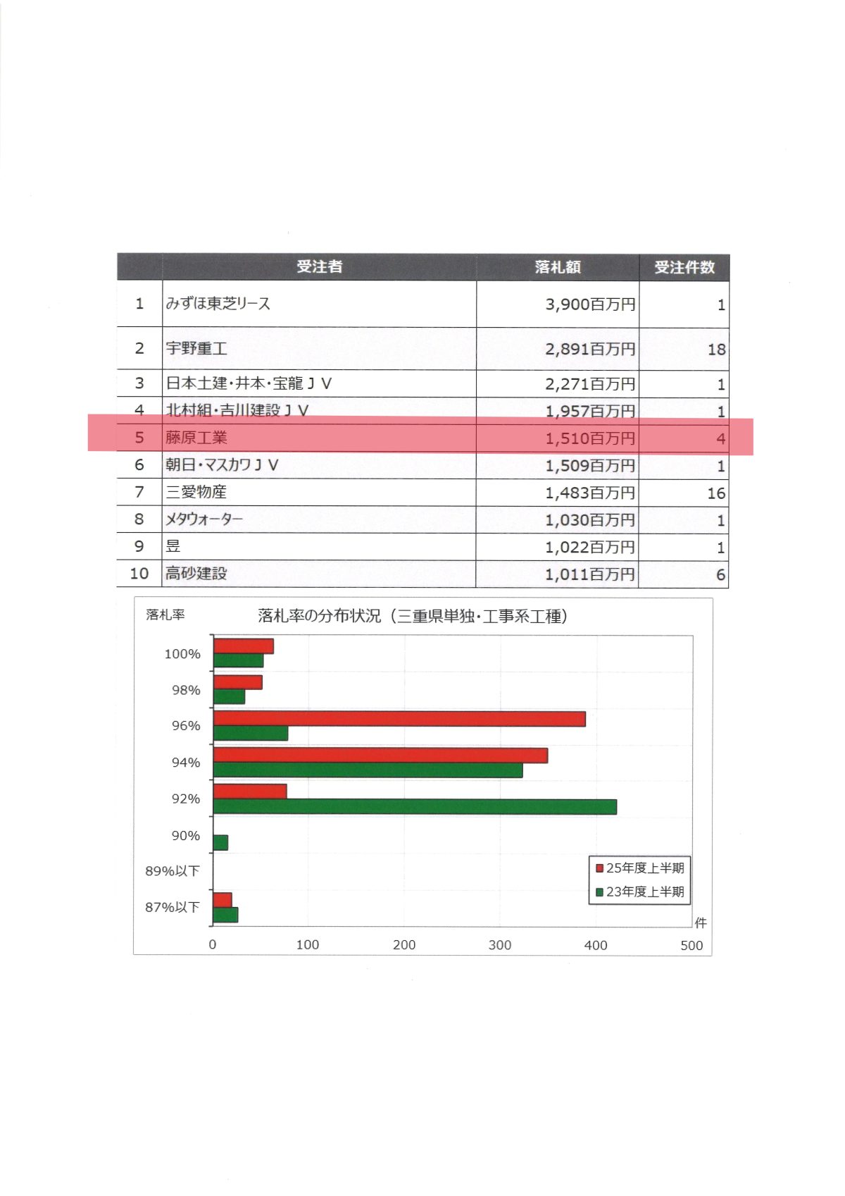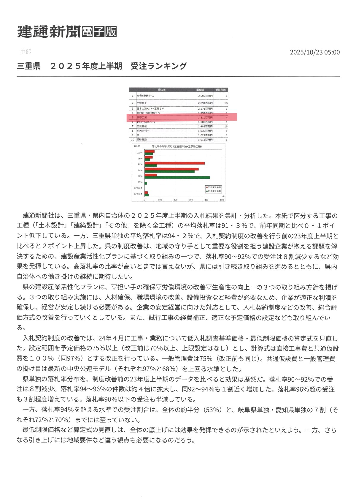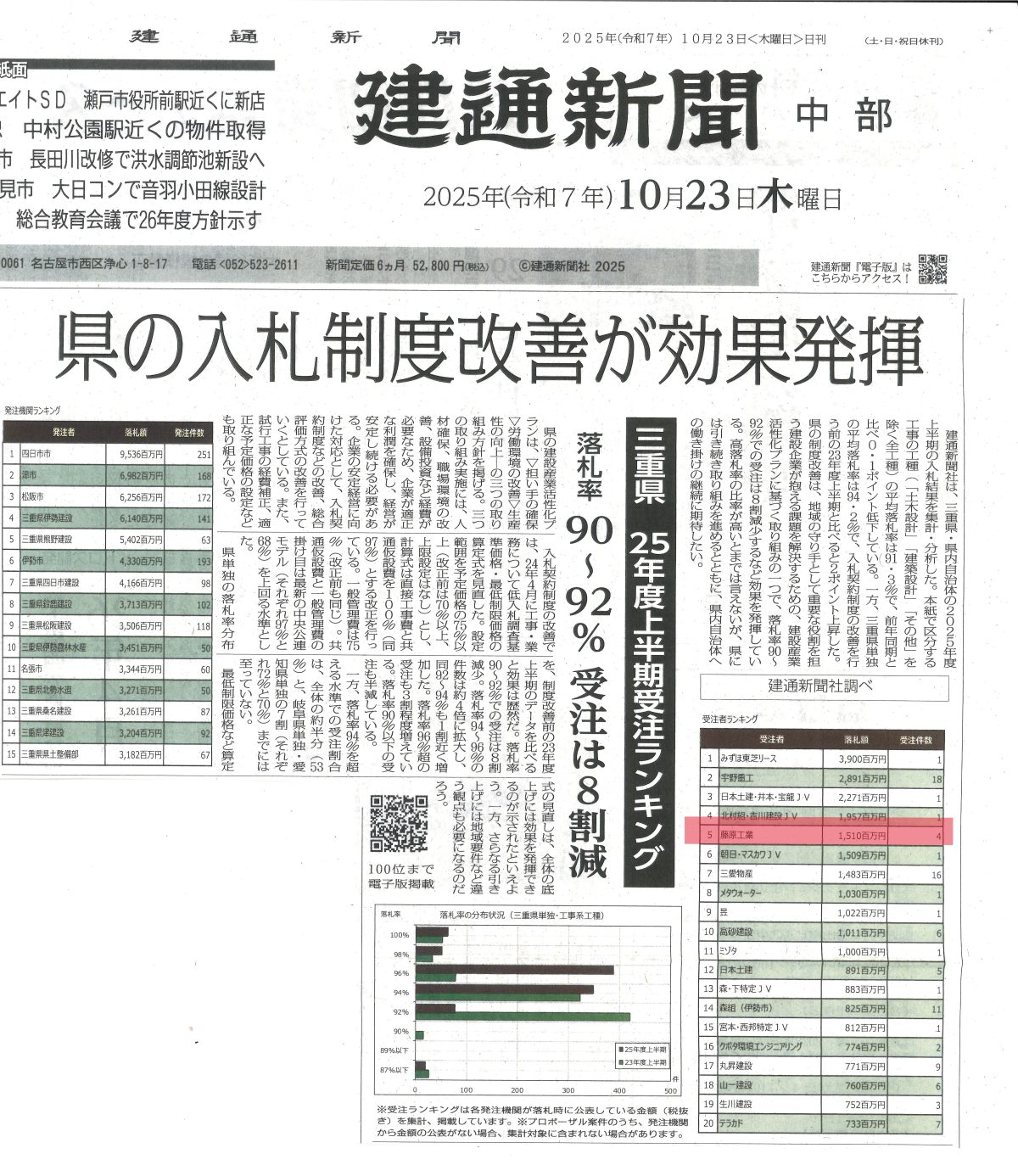 三重県25年度上半期受注ランキング第5位〔管工事では三重県1位〕【建通新聞】