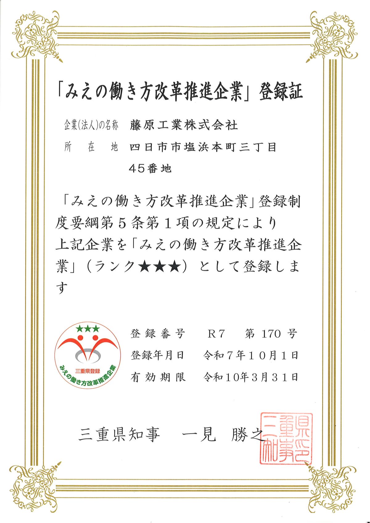 「みえの働き方改革推進企業」ランク★★★三つ星登録企業